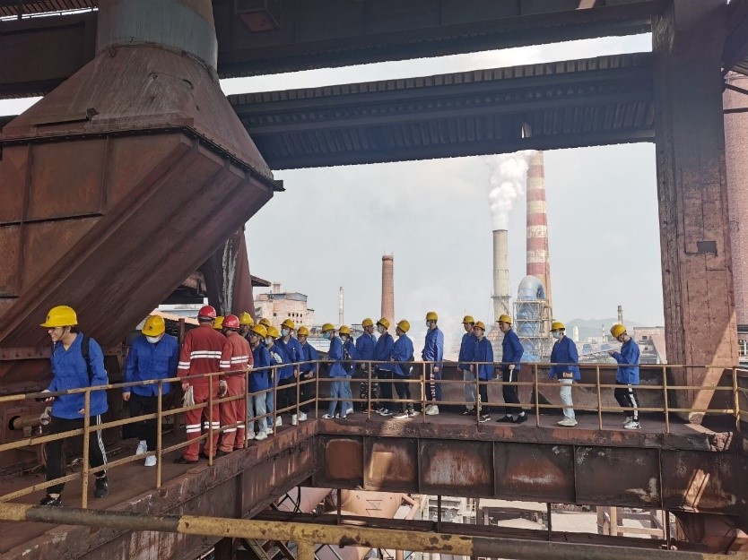 高炉炼铁车间内,从工艺流程、工程控制、显示界面进行了系统的学习,并亲自前往高炉内,感受火焰灼烧的温度。