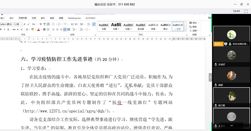 首先,全体党员重温了入党誓词,因为网络延时原因而显得不同步,但全体党员声音洪亮,满怀打赢疫情防控阻击战的强烈信心。然后支部讨论了学习贯彻习近平总书记关于新冠肺炎疫情防控系列重要讲话活动的自学心得。吴敏经理表示,越是艰难的时候,越能体现共产党员的本色,越能体现领导干部的能力,越能体现党员干部的担当,我们要结合当前疫情防控工作的具体情况,认真领会有关精神,使之贯彻落实到我们公司的疫情防控工作和教学科研工作中,扎扎实实完成疫情防控工作和教学科研任务。陈鑫老师表示,对比国外的疫情防控出现的多种问题,国内疫情的较好控制体现了党的领导力和人民群众的积极配合,工作的全局性和调整的迅速,也展现了我们作为负责任大国的国际担当,在疫情防控中,党员同志的先锋模范带头作用也得到了充分的体现,每个人都是责任人的思想让我们每位教职工做好本职工作,做好自己的职责和担当。董凯锋老师表示,这次疫情从最开始的爆发到目前得到有效的控制,都体现了我党英明的决策,果敢的执行力,以及把为人民服务的意识始终贯彻到实处的魅力,充分体现了我党的优越性。葛健老师讲到,国内疫情防控工作成效明显,通过和国外学习老师的交流和反馈来的感受,更能体会到国内党和政府的防控优势,全国一盘棋,积极防控。王亚午老师讲到,以习近平同志为核心的党中央把人民群众生命安全和身体健康放在第一位,迅速做出一系列重大决策,作为一名党员,需要进一步增强“四个意识”、坚定“四个自信”、做到“两个维护”,坚决贯彻落实习近平总书记重要讲话和一系列重要指示精神,牢记人民利益高于一切,紧密结合岗位职责,从自身做起,以实际行动践行听党话、跟党走的初心使命,体现“三个表率”的使命担当。其他老师或发言或将以文字的形式,阐明了自己的学习心得。