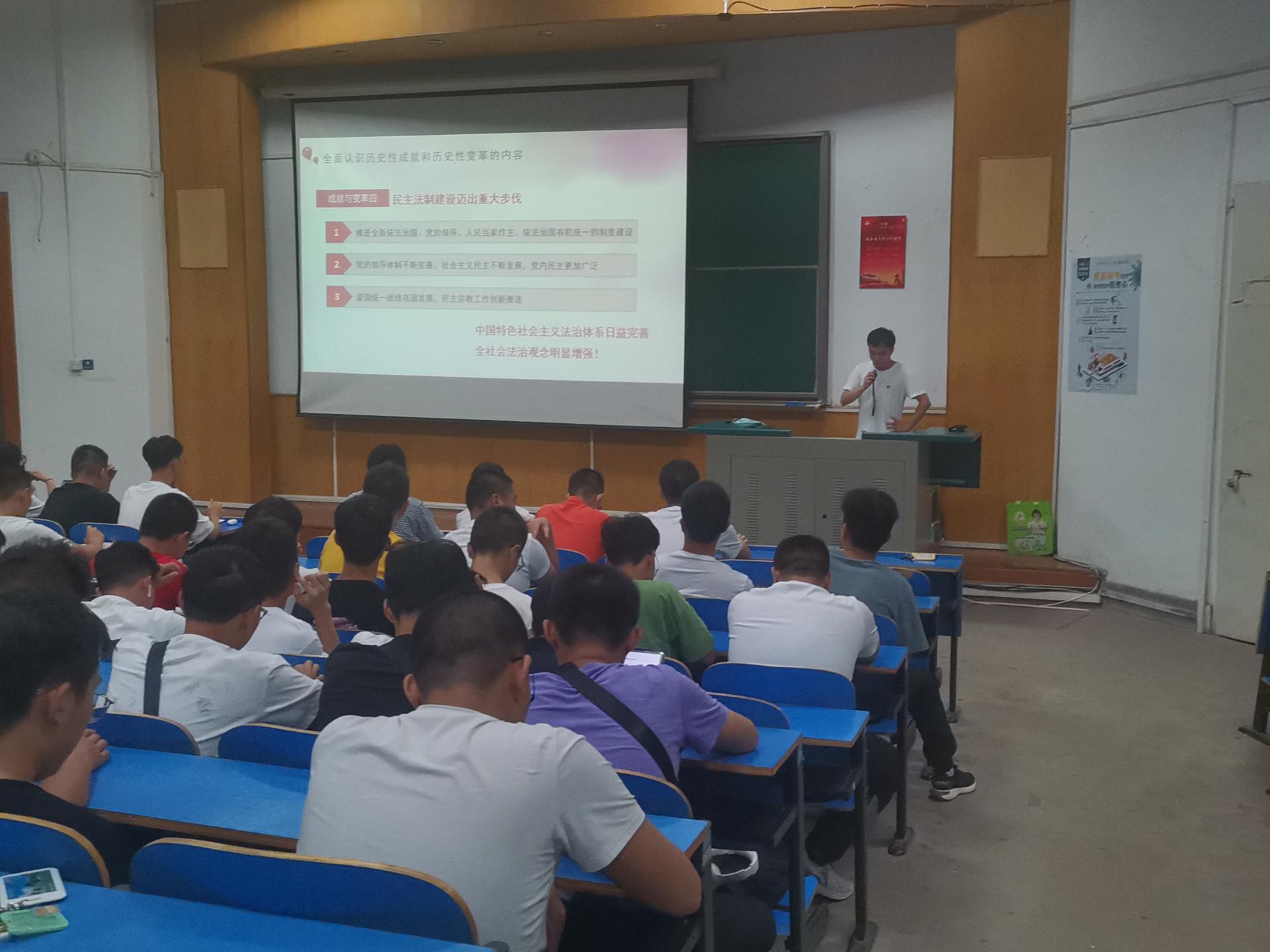 “忽忘国耻,振兴中华”。控制工程硕士生第一党支部主要从抗日战争的开始、中华民族全面抗战、抗日战争胜利的意义和中国共产党在抗战中的作用四个方面来讲述中国人民在中国共产党领导下的抗日战争抗日战争的胜利洗刷了中华民族自鸦片战争以来的百年耻辱控制工程硕士生第二党支部主要从政治协商会议的召开、国民党破坏民主和平团结统一、全面内战爆发和解放战争带来的深刻启示四个方面介绍解放战争解放战争的胜利充分展现了人民群众蕴含的磅礴伟力,中国共产党坚持全心全意为人民服务,得到了人民群众的拥护和支持