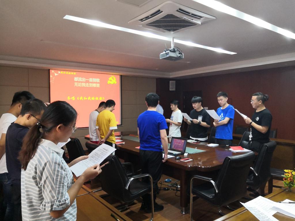 首先,全体与会党员齐唱《中华人民共和国国歌》,重温入党誓词。党支部新接收党员7人,乔金龙介绍了党支部的基本情况。随后,乔金龙带领大家学习了党章第五章的内容,主要涉及党的基层组织、组织机构的设立等知识。接着,支部开展强化理想信念,牢记初心使命的专题学习,内容分为两部分:自学内容和实践内容。乔金龙对自学内容作了详细阐述,鼓励大家发挥主观能动性,采用线上线下相结合的方式开展形式多样的自学活动,支部后期将陆续开展辛亥革命纪念馆实地参观、学习之路主题党课等实践活动。专题学习后,支部成员观看了新中国成立70年成就系列短片,深刻感受了新中国成立70年来国家和人民生活发生的巨大变化,支部成员都为此感到骄傲与自豪。接下来,支部开展“为党员过政治生日”活动,九月份入党的党员齐信钊同志结合自身成长过程,讲述了自己入党前后思想以及政治素养的改变与提升情况。最后,支部全体成员合唱《我和我的祖国》,庆祝新中国70华诞。