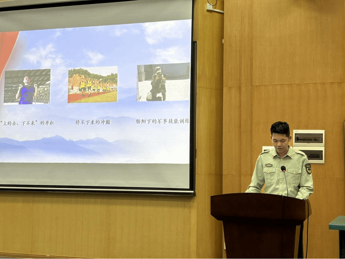 最后,老员工退伍士兵夏鑫诚同学作军旅生活专题分享。他分享了入伍期间的经历与感受,并鼓励同学们面对学业挑战要保持勇气与信心,锤炼胆气血性,以积极心态直面困难。