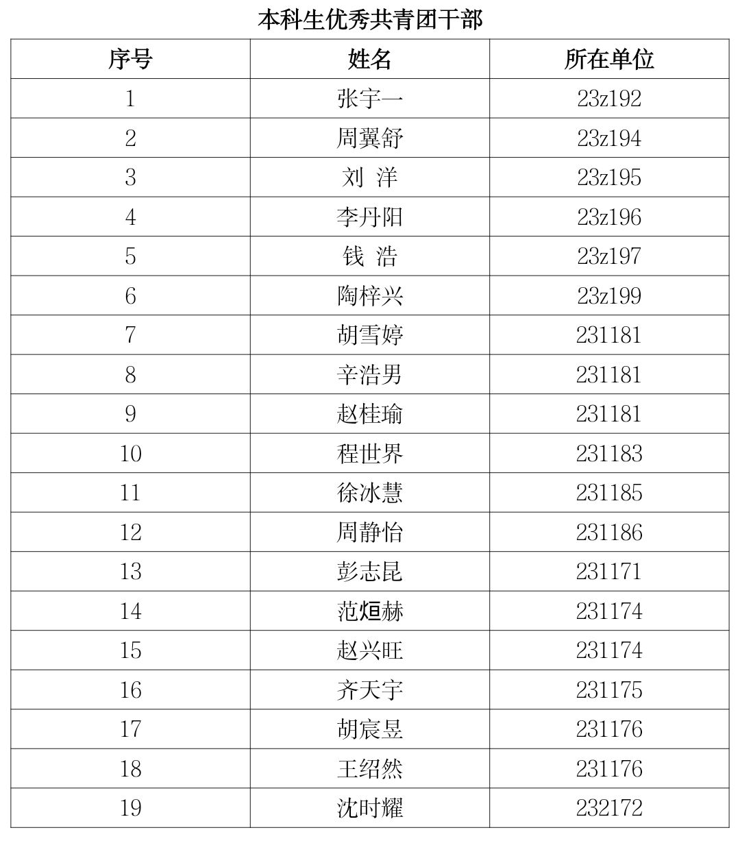 根据公司团委总体要求和公司实际情况,经个人自主申请,公司组织评定,最终评选出本科生优秀共青团干部19人、优秀共青团员26人、百名好班长/好支书共5人、五四红旗团支部2个、五四红旗团支部标兵1个(推荐至公司参加评审);研究生优秀共青团干部9人、优秀共青团员8人、五四红旗团支部1个,现将名单予以公示: