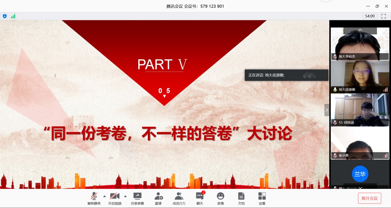 围绕这次疫情大考中国展现出来的制度优势和当代青年责任担当,中国地质大学(武汉)和中国石油大学(华东)多名同学发表了自己的看法。地大的徐源徽同学说到:“这次疫情对于广大青年而言是一次特殊的‘成人礼’,我们用行动证明:新时代的中国青年是好样的,是堪当大任的。”地大的孔思栋谈到:”我们每个人也要用青春去践行五四精神,让青春在为祖国,为人民,为民族,为人类的奉献中焕发出更加绚丽的光彩。” 地大的张宇一说:“在党和政府的领导下,复工复产正在有序推进,勤劳勇敢的中国人民一定能战胜疫情。”石大的刘璐璐说:“我敬畏那些在疫情中奉献的青年,我敬佩他们勇于担当,不畏艰险。”最后,石大地质1901的班长柴君林和地大23Z192班的团支书周汶昊做表态发言,周汶昊说到:“我们青年人将不负建功立业的人生际遇,不负天降大任与斯人的时代使命,不负党的期望、人民的期待、民族的重托,用努力奋斗的青春,使自己成长为一个有理想、有本领、有担当的时代新人。我们青年要在为人民服务中茁壮成长,在艰苦奋斗中砥砺意志品质,在实践中增长工作本领,让青春在党和人民最需要的地方绽放绚丽之花。”