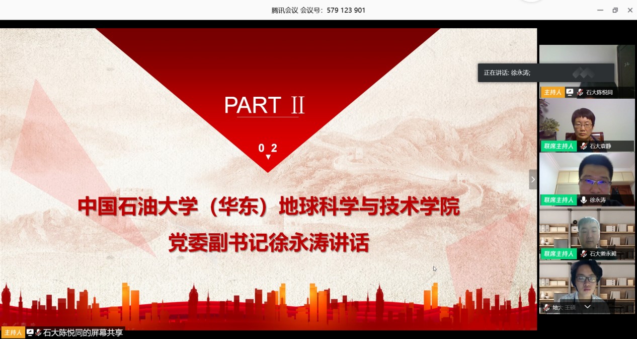 中国石油大学(华东)地球科学与技术公司党委副书记徐永涛围绕此次疫情彰显的制度优势,政局稳定,以人民为中心集中力量办大事,社会保障公平,人类命运共同体等进行讲述,他还分析了目前国外的局势,充分展现了中国在面对此次疫情所做出的巨大贡献,展现了党和国家的底线思维和忧患意识。他说:“在对于一个事物或者人,如果想要树立信念和信任,一开始要从理智上认同它,从而在感情上产生热爱,最后形成信仰”。他激励同学们要相信党和政府,要在奋斗中谱写大写的青春,让青春梦想在民族复兴的伟大梦想里尽情的绽放。