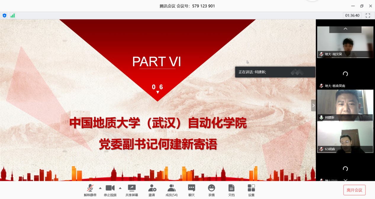 (通讯员:黄兰华 周汶昊)为学习贯彻习近平总书记关于疫情防控工作的系列重要讲话和指示批示精神,认真贯彻落实习近平总书记给北京大学援鄂医疗队全体“90后”党员的回信精神,5月2日晚19:30,中国地质大学(武汉)自动化类专业23Z192班与中国石油大学(华东)地质类1901班“云”端相聚,联合开展以“绽放战疫青春,坚定制度自信”为主题的线上团会。本次团会出席的嘉宾有中国地质大学(武汉)公司党委副书记何建新,团委副书记许彦,2019级辅导员黄兰华,中国石油大学(华东)地球科学与技术公司党委副书记徐永涛,团委书记霍宁宁,团委副书记姜永昶,地质类1901班主任袁静教授,山东大学齐鲁医院内分泌科护士长郑会珍。本次主题团会坚定青年员工制度自信,激励员工练就过硬本领,投身强国伟业,始终保持艰苦奋斗的前进姿态,在实现中华民族伟大复兴中国梦的新长征路上奋勇搏击。