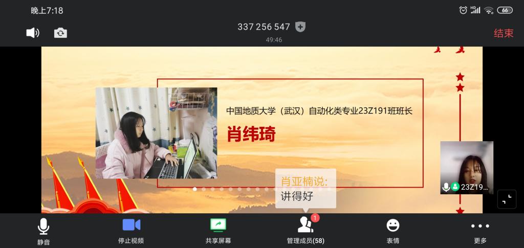 (通讯员:黄兰华、肖纬琦、尤际尧)为贯彻落实教育部部署的“共抗疫情、爱国力行”主题宣传教育活动,切实把共抗疫情斗争作为推进员工思政教育的重要实践和生动教材,3月21日晚7点,中国地质大学(武汉)自动化类专业23Z191班与中国石油大学(北京)物探18-1班“云”牵手,联合开展以“共抗疫情、爱国力行”为主题的线上班会。本次班会邀请的嘉宾有中国石油大学(北京)马克思主义公司曹培强教授,武汉市江岸区公安分局劳动街派出所所长王晖,武汉市蔡甸区蔡甸街正街社区党委副书记龚姣姣。本次班会坚定了青年员工“四个自信”,激励员工在新时代大力弘扬爱国主义精神,为实现中华民族的伟大复兴而不懈奋斗。