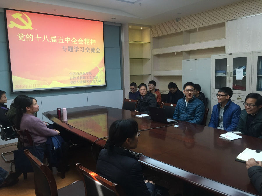 (通讯员  刘亚锋)12月3日下午,公司自控系教职工党支部与控制科学与工程专业硕士研究生党支部在教二楼615会议室召开“党的十八届五中全会精神专题学习交流会”。会议由自控系教职工党支部书记吴涛老师与研究生党支部书记刘亚锋共同主持,两个支部所有党员参加了会议。