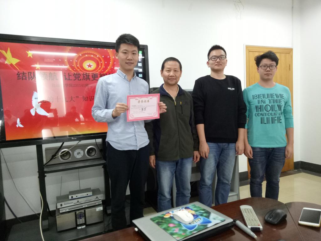 2017年11月9日,231141班、231142班以“结队领航,让党旗更辉煌”为主题的党的十九大知识竞赛在师生的积极筹备下如期进行。知识竞赛于当天中午十二点半在信息楼603正式开始,参与本次活动的有陈珺、蔡鄂、龚文芳、王永涛、谢桂辉五位老师以及231141班和231142班包括党员和积极分子在内的17位同学。