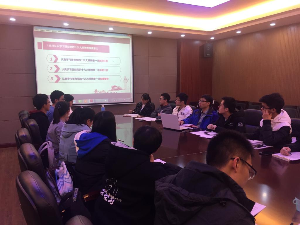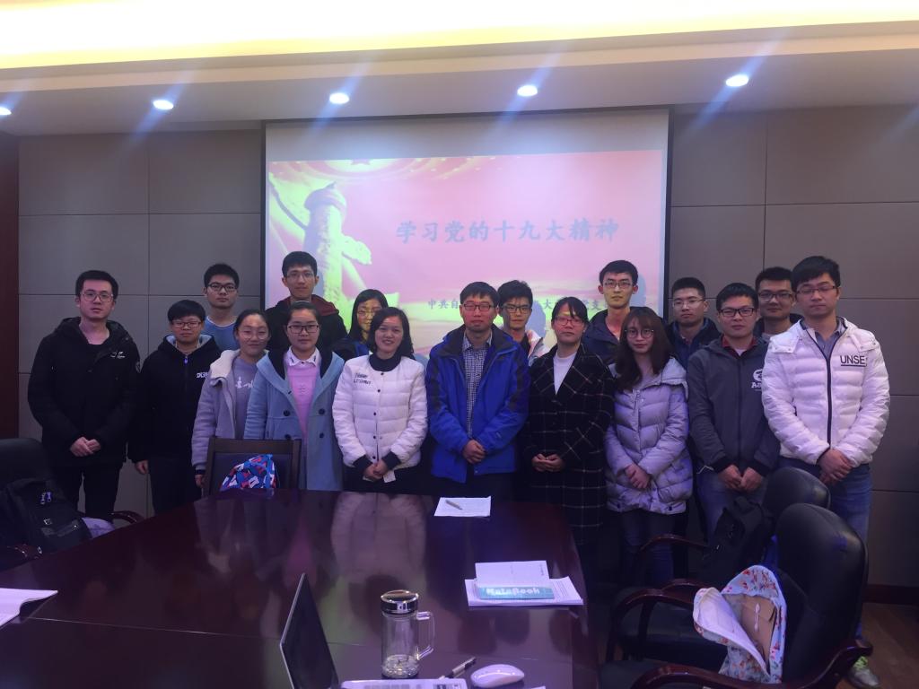 谭文伦老师带领党支部成员及积极分子学习十九大精神,要求大家认识到学习十九大精神的重要意义,在学习习近平总书记十九大报告的过程中应结合自身的专业特点,从报告中发掘与专业相关的内容,谭老师介绍十九大是党和国家事业发展进程中具有划时代意义的里程碑,以亲身经历阐述了我国社会主要矛盾已经发生了转变这一事实,并强调作为中共党员,应特别学习并牢记修改后的《党章》,多多关注国外主流媒体的评价,结合自身情况进行思考。