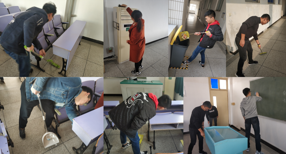 随后,没有课程安排的党员回实验室取来了卫生工具,大家一起前往教学楼进行卫生清洁。同志们使用抹布对桌面、空调、桌椅等设施进行全面的清洁,桌面上的乱涂乱画痕迹,经过大家的认真清洁,都变得干净整洁。负责扫地和清理桌洞的同学认真负责地清理走了存在的垃圾,并用拖把清理了地上的污渍。清理教室时,大家分工明确,积极主动,在极大的提高了工作效率的同时,也培养了彼此之间的默契。