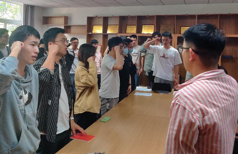 会议第一项,全体同志起立,奏唱中华人民共和国国歌。 会议第二项,全体同志起立,支部书记彭劢带领支部党员重温入党誓词。