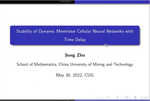 2022年5月30日下午,应公司王雷敏教授的邀请,中国矿业大学朱松教授给公司研究生开展学术报告。本次学术报告以线上线下相结合的形式,在腾讯会议和信息楼310报告厅同时举行。公司王雷敏教授、翟超教授、万雄波副教授以及公司的部分研究生参加了此次报告会。本次学术报告会的题目是Stability of Dynamic Memristor Cellular Neural Networks with Time Delay。