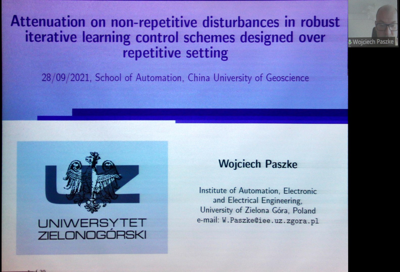 开幕式后,北京师范大学-香港浸会大学联合国际公司王庆国教授在线上为师生作了题为《Control Design with Guaranteed Transient Performance: An Approach with Polyhedral Target Tubes》的学术报告,波兰绿山大学Wojciech Paszke副教授作了题为《Attenuation on Non-Repetitive Disturbances in Robust Iterative Learning Control Schemes Designed Over Repetitive Setting》的学术报告。