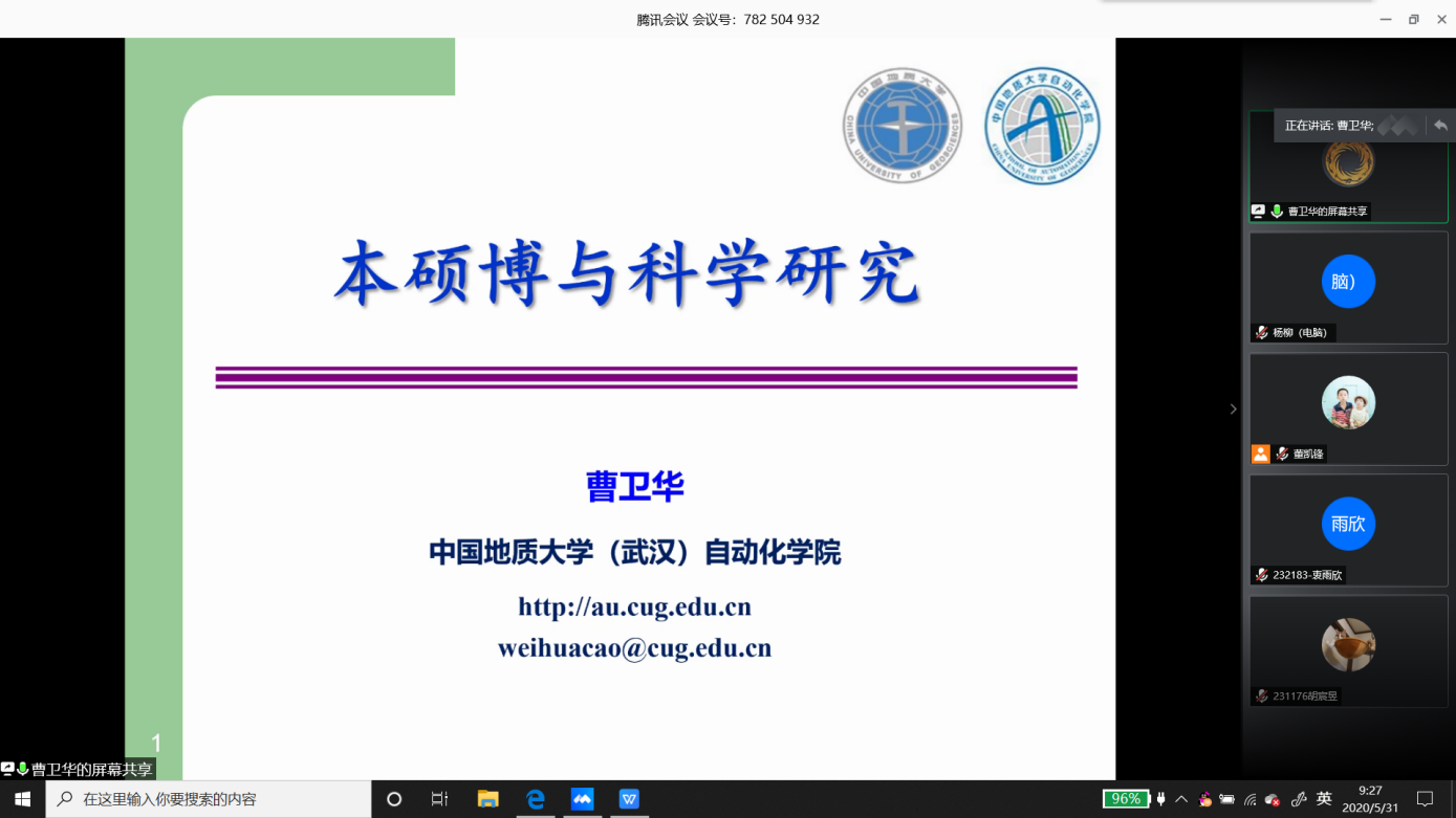 2020年5月31日上午,公司为“自动化科学菁英计划”组织召开了云端报告会。常务副经理曹卫华教授应邀作了题为“本硕博与科学研究”的报告,副经理宗小峰教授参与了讨论和交流。报告会由董凯锋教授主持。