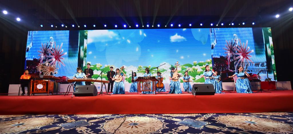 本次演出是海百合首次公开登台亮相演奏扬琴,与公司民乐团演奏的编磬、古筝、琵琶、二胡、竹笛等多种民族乐器一起协同表演,展现了艺术与科技的交互融合,呈现出良好的艺术表演效果。