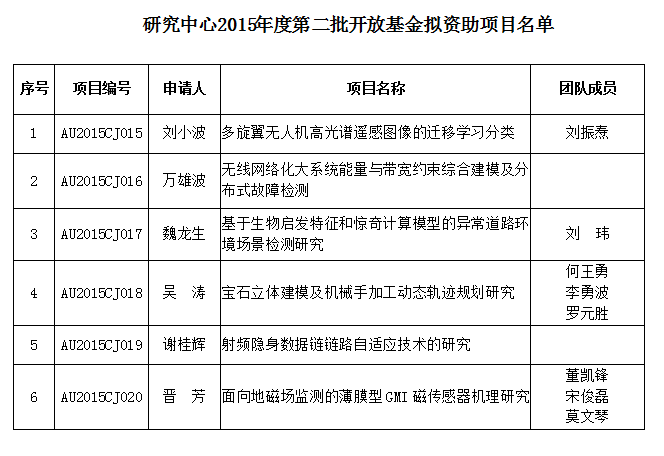 根据《复杂系统先进控制与智能地学仪器研究中心2015开放基金项目申请指南》和开放基金(第二批)申请通知,至申请截止日共收到6项开放基金项目申请书,按照“公平竞争,择优支持”的原则,研究中心学术委员会外审专家对所有开放基金项目申请书进行了评审。经院学术委员会审议,拟资助 “多旋翼无人机高光谱遥感图像的迁移学习分类”等6个项目作为2015年度第二批开放基金项目,现予以公示。公示时间:2016年1月15日至1月18日。公示期间,如对项目资助有异议,请以书面形式反馈公司办公室。