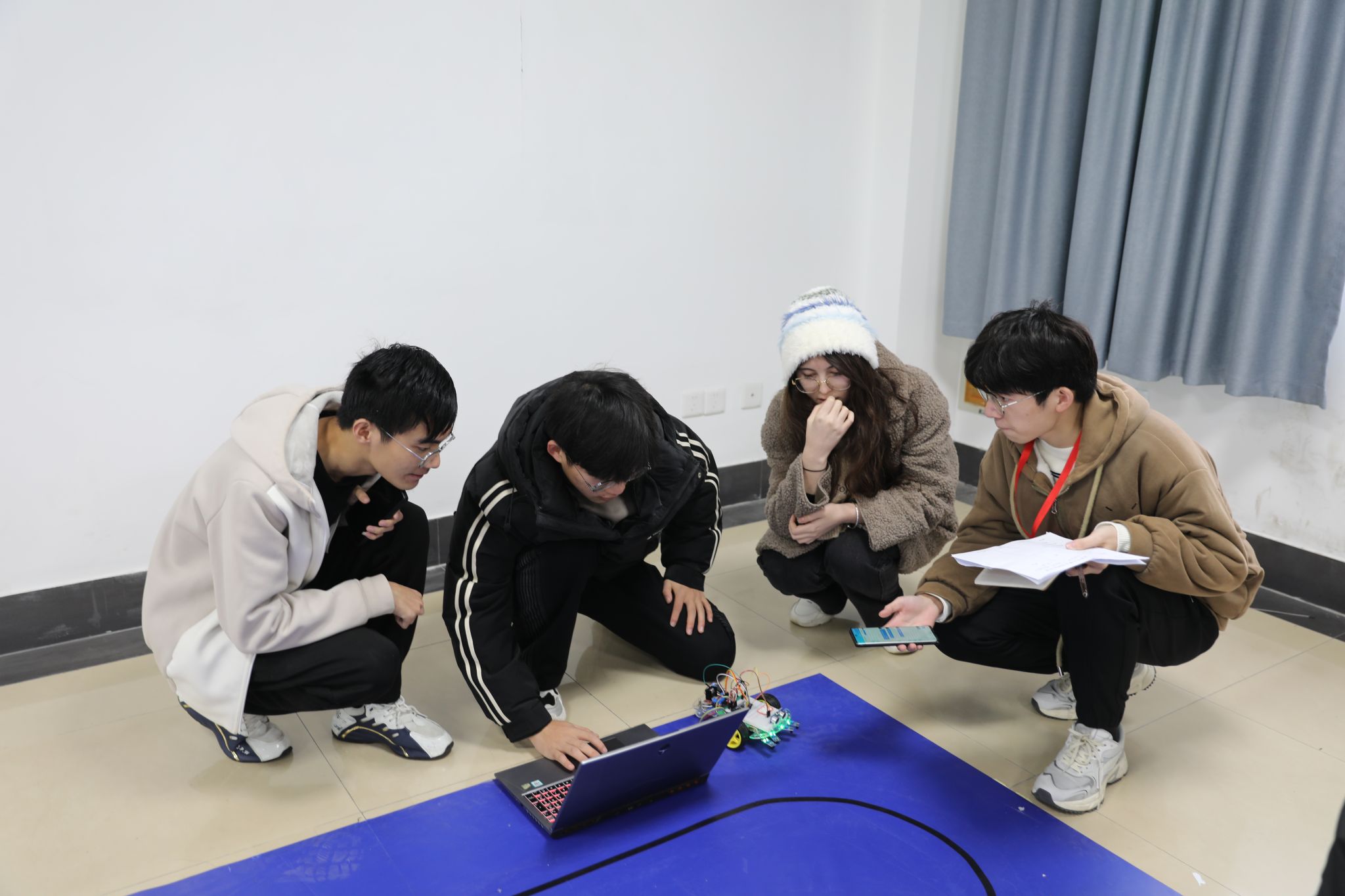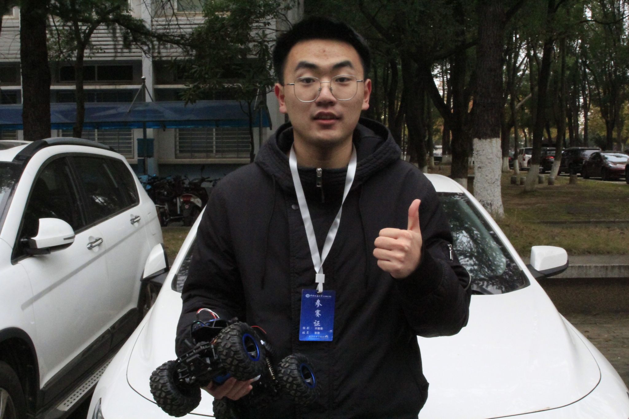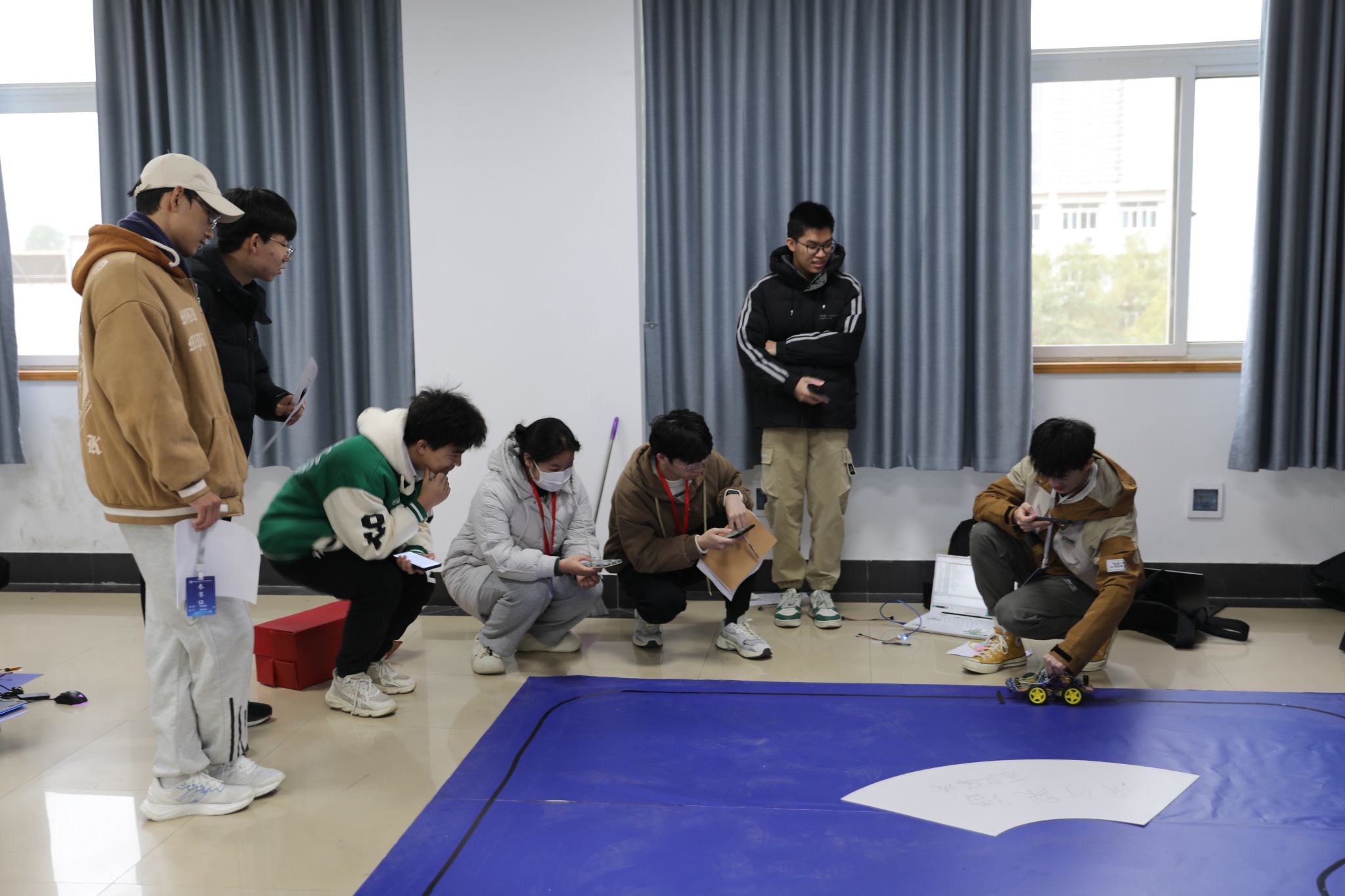 兴趣组由崔继凡担任主裁判,每支队伍有5分钟现场调试时间和3分钟比赛时间,最终表现优异的选手胜出。参赛团队的智能小车需要先在测试场地进行小车基础项目的检验,选手们操纵小车,展示了前进、后退、左转、右转等基础操作以及其他创新项目。测试合格后再转入比赛场地,进行上坡和绕锥桶绕弯等加强项目的较量,上场的选手们即使在寒风凛冽中也仍保持着比赛激情,一辆辆小车飞跃坡道,顺利绕桩,流畅完成全赛道,引起阵阵欢呼,准备中的选手们也时刻关注赛场进程,积极进行赛前调试,力争赛出最佳水准。