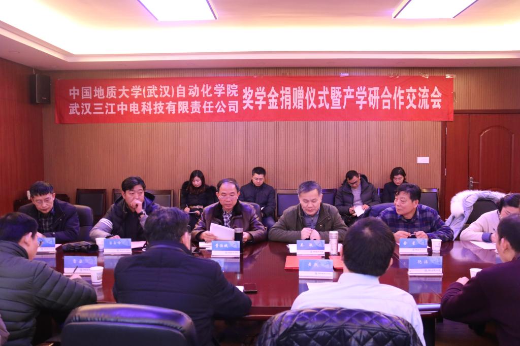 董浩斌书记代表全院师生对武汉三江中电科技有限责任公司的捐赠表达感谢和敬意期待双方在智能控制领域紧密合作和互补吴敏经理充分肯定该公司为中国教育奉献的行为和双方的合作前景他为嘉宾介绍公司的团队规模高端人才研究力量以及在智能电网机器人等方面成功应用案例武汉三江中电科技有限责任公司黄凯董事长发言他介绍了企业的业务领域希望校企双方彼此加深了解在优化技术核心产品方面深入合作公司员工工作与教育基金管理处吕占峰副处长作了发言对三江中电捐资助学表示感谢