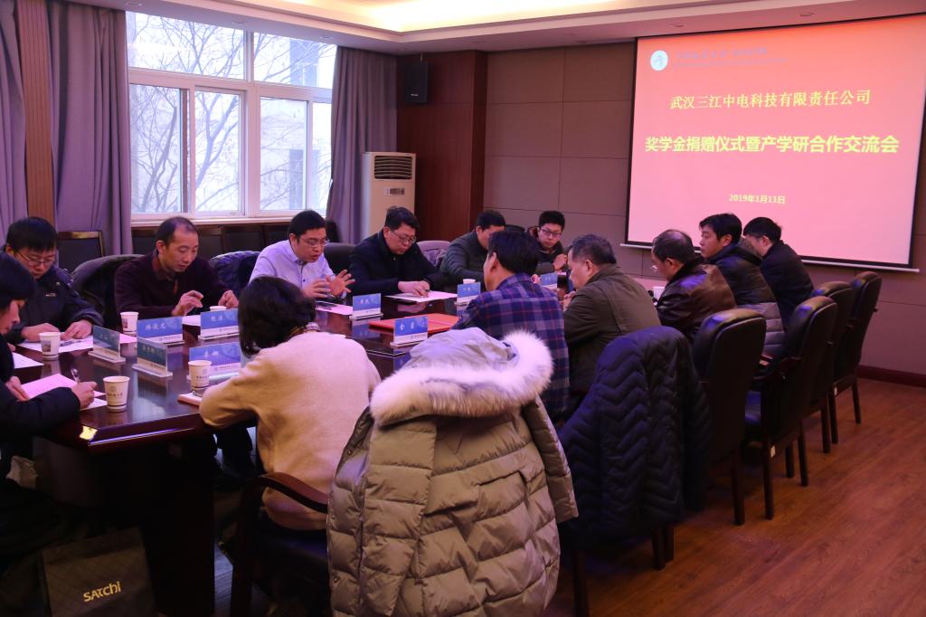 111武汉三江中电科技有限责任公司奖学金捐赠仪式暨产学研合作交流会在公司会议室举行武汉三江中电科技有限责任公司董事长黄凯总经理叶鹏一行9公司员工工作与教育基金管理处副处长吕占峰公司经理吴敏党委书记董浩斌副经理金星曹卫华等院领导和相关教师出席了捐赠仪式副经理金星主持仪式