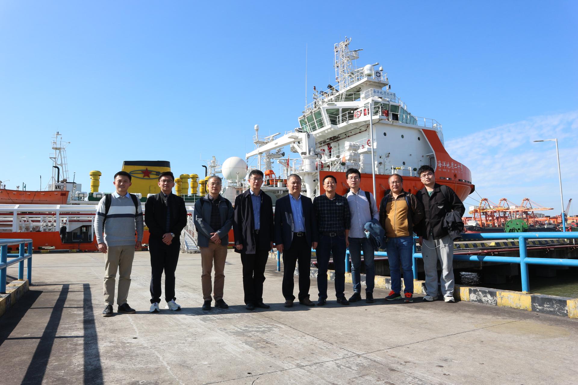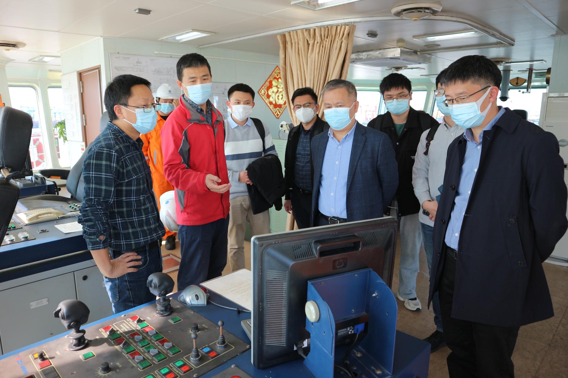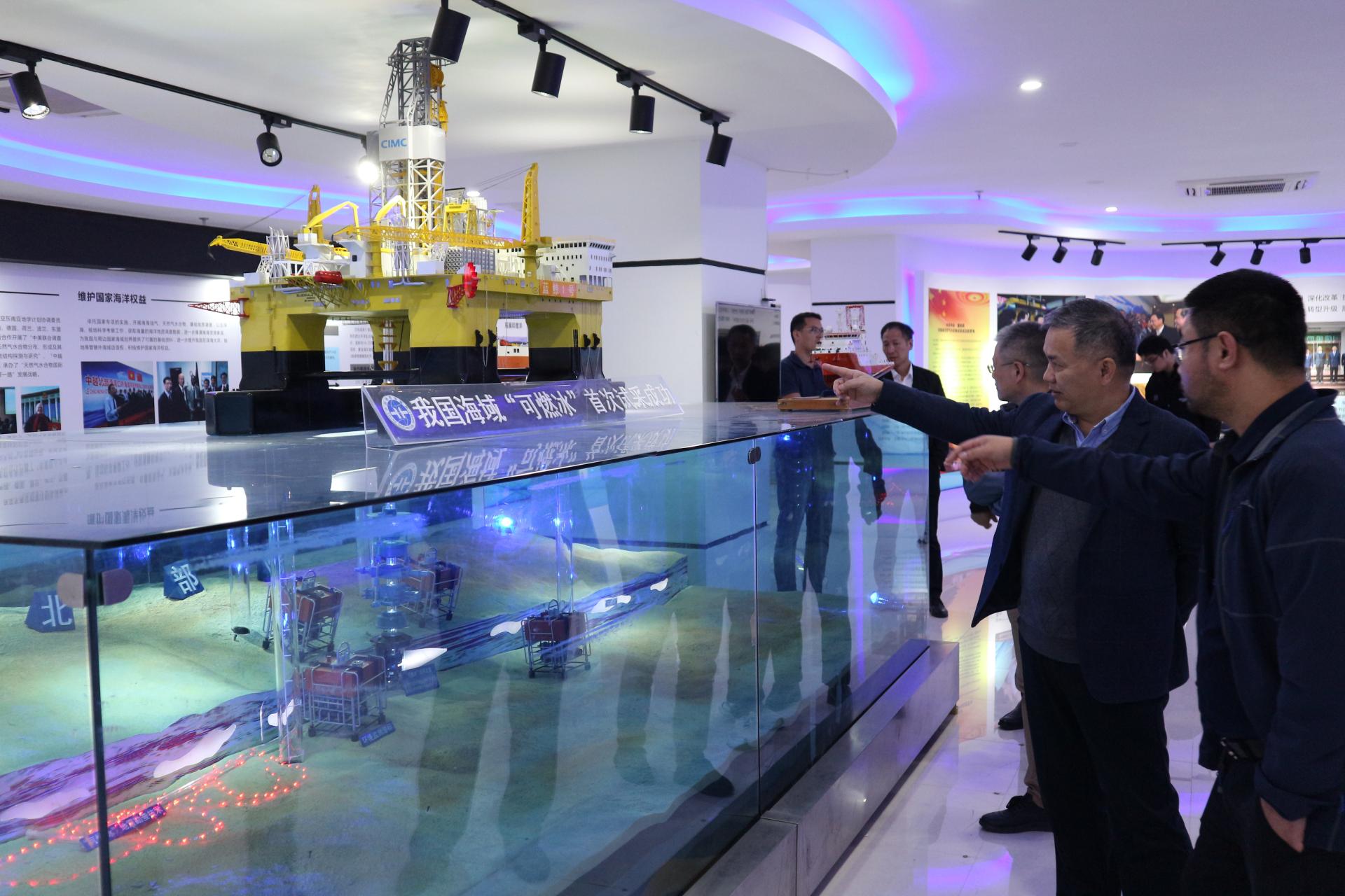 在介绍了各自的科研工作后,双方就如何开展合作进行了讨论。会后,吴敏、曹卫华一行参观了陈列馆和设备库,并到码头参观了海洋地质调查船,就海洋水文地质调查装备智能化问题展开了调研。