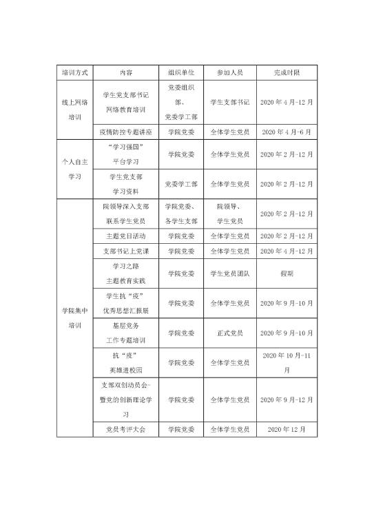 员工党员教育培训工作是高公司党建的基础工程,也是思想政治工作的重要抓手。为学习贯彻习近平新时代中国特色社会主义思想和党的十九大精神,持续深入推进“两学一做”学习教育制度化、常态化,推动高校建立“不忘初心、牢记使命”主题教育制度,引导员工党支部以政治建设为统领,以组织力提升为重点,全面提升党建工作质量。按照2020 年公司工作总体部署和公司员工工作要点,结合疫情防控新形势新变化,现将 2020 年度员工党员教育培训计划的有关事项通知如下,请各员工党支部认真落实。