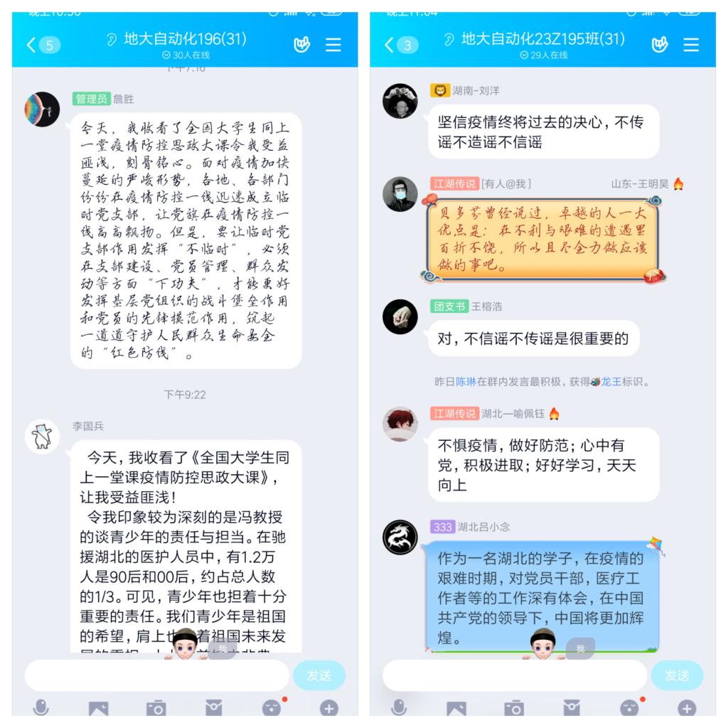 自动化专业共青团员陈文 疫情就是命令,防控就是责任。在这场众志成城、同仇敌忾的战斗中,中国人民的团结信念和责任感令世界印象深刻。多难兴邦,中华民族数千年的文明史上,经历过多次灾害,但是灾害是压不垮伟大的中华人民的,在以习近平同志为核心的党中央正确的领导下,英雄的中华人民一定会夺取最终的胜利。经过一堂思政课的教导,我明白了许多。士不可以不弘毅,任重而道远,少年强则国强,少年独立则国独立。君可见,此次疫情当中,已有无数同辈前去战疫一线,学着先辈的模样,挡下死神前进的步伐。爱国,就是最大的责任担当,文明的薪火相传,要看我们每一代人承担起责任与担当。苟利国家生死以,岂因祸福避趋之!我辈中华人民即将担任起为实现中华民族伟大复兴而努力的重任。这不仅仅是一堂课,更是对我们人生的引领。