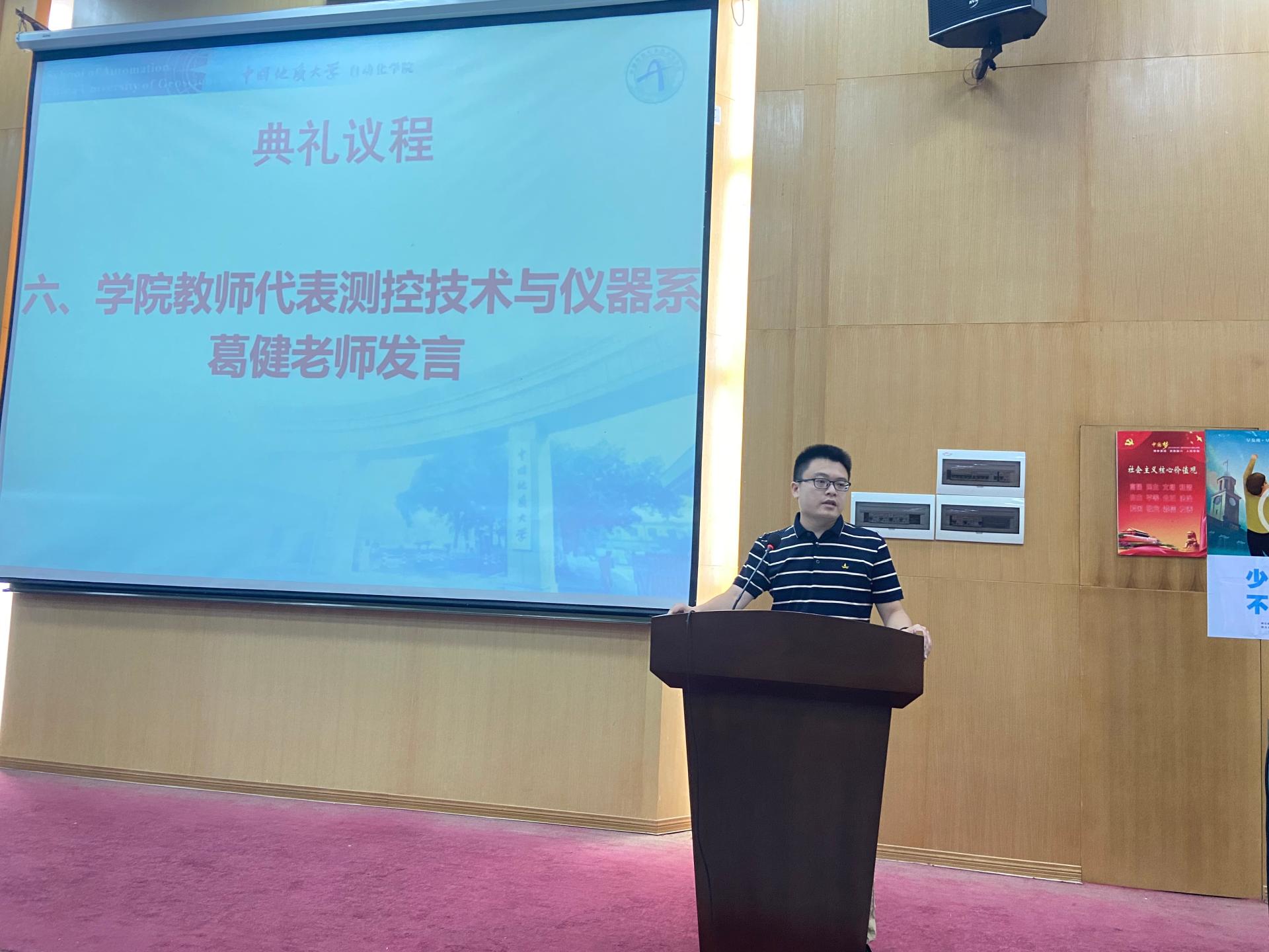 测控技术与仪器系葛健老师代表公司教师发言。他希望同学们可以树立崇高理想,刻苦学习,始终为了自己的梦想努力奋斗,把个人的成长与公司和公司的发展融合起来,成为新时代的优秀创新人才。