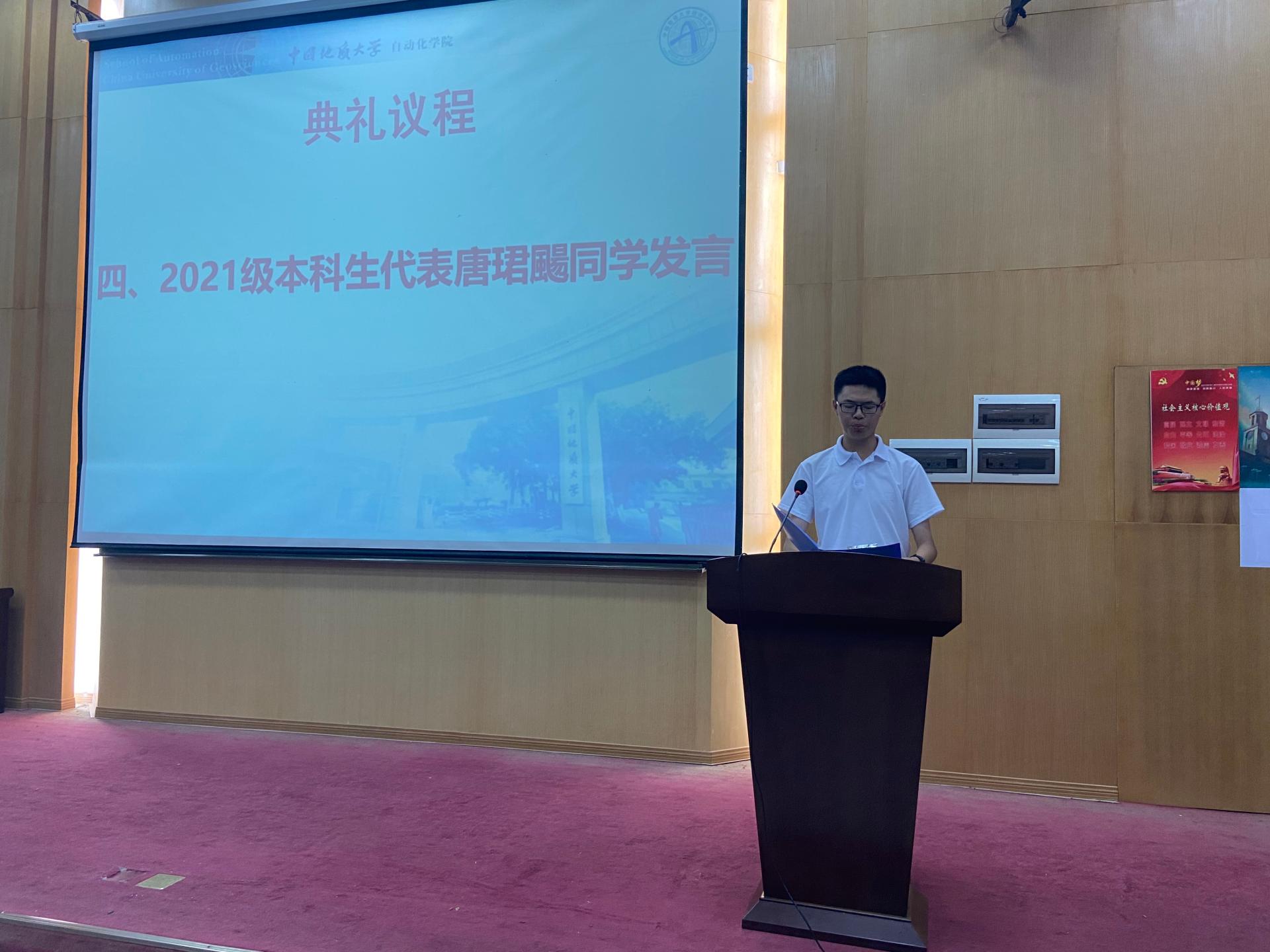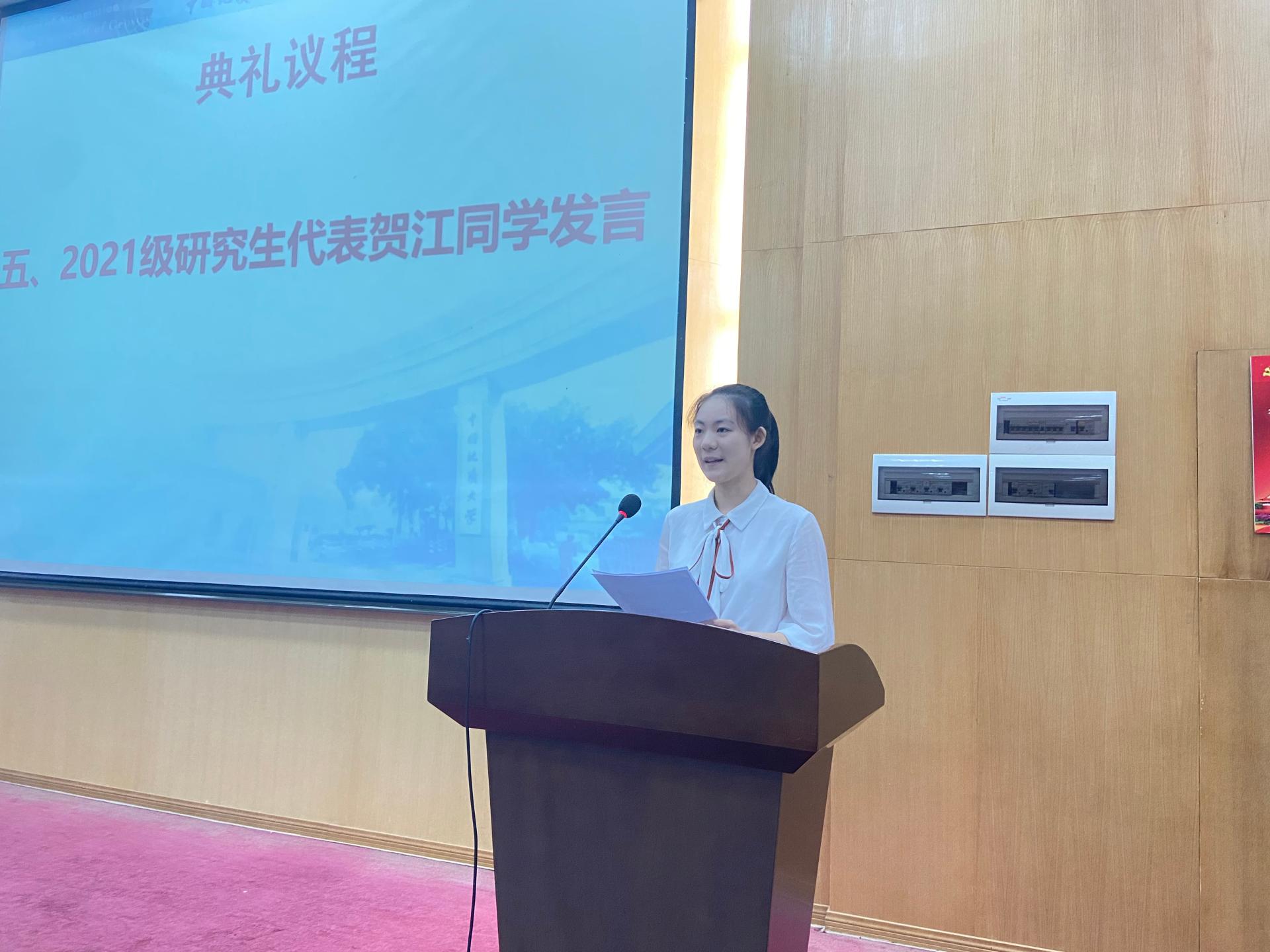 2021级本科生代表唐珺䬗同学和研究生代表贺江同学先后代表新生发言。唐珺䬗同学通过对地大学子往昔奋斗路的追溯,到如今地大人才辈出的感悟,表达了作为新时代的年轻力量,希望可以在未来成果祖国建设的中流砥柱。
