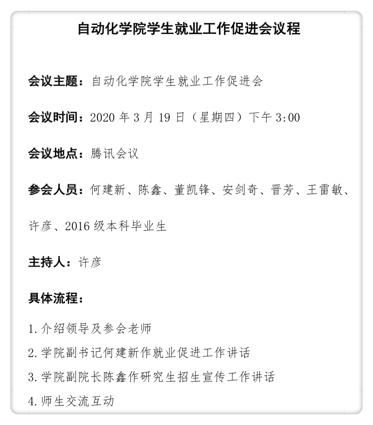 为全面落实公司《关于切实加强2020届毕业生就业工作的通知》的要求,坚持做好“一手抓好疫情防控,一手抓好就业工作 ”,切实帮助员工顺利、尽早就业。3月19日下午,公司召开2020届毕业生就业工作促进会,公司党委副书记何建新、副经理陈鑫、各系主任和教师、2016级毕业生等共94名师生参加,会议由毕业生辅导员许彦主持。