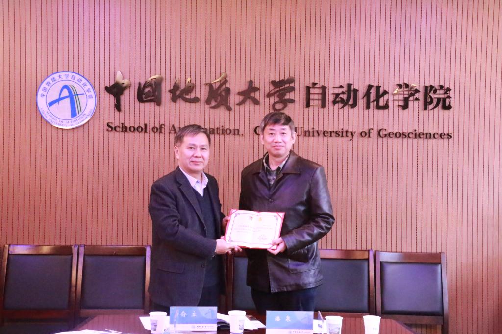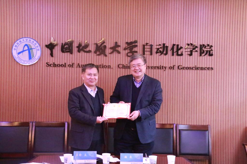 会后,吴敏教授向于海斌研究员、胡德文教授颁发重点实验室学术委员会委员聘书。于海斌研究员应邀向公司师生作了题为《工业互联网——互联网+制造业的一种范式》学术报告。
