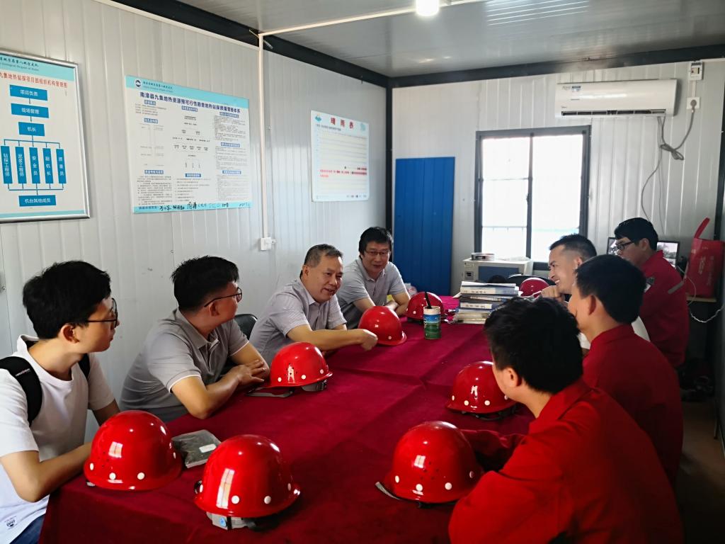 在钻探现场,徐经理向各位老师详细地介绍了地热勘查项目的具体情况以及后续开发计划。双方就涉及地质装备智能化方面的产品研发和工程应用展开了热烈的讨论和交流。公司团队所承担的湖北省技术创新专项重大项目“复杂地质环境钻采装备关键技术开发与应用”正依托该勘查项目开展科技合作,目前项目进展一切顺利。最后,双方就成立产学研基地、开展合作研究等事宜进行了协商,并达成了诸多共识。