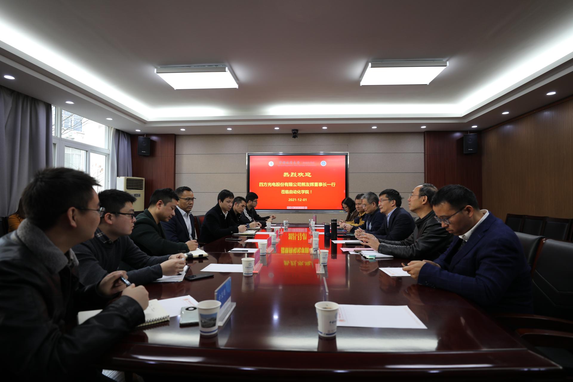 2021年12月1日,四方光电股份有限公司(简称:四方光电)董事长熊友辉一行4人应邀来公司交流,经理曹卫华、公司党委书记董浩斌、副经理陈鑫以及相关科研实验室负责人参加交流座谈会。