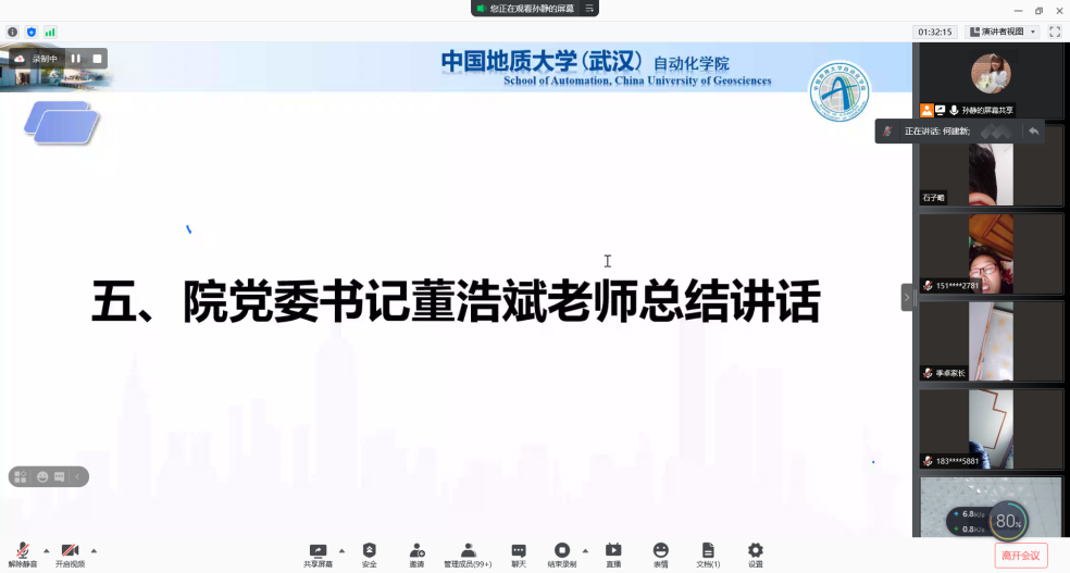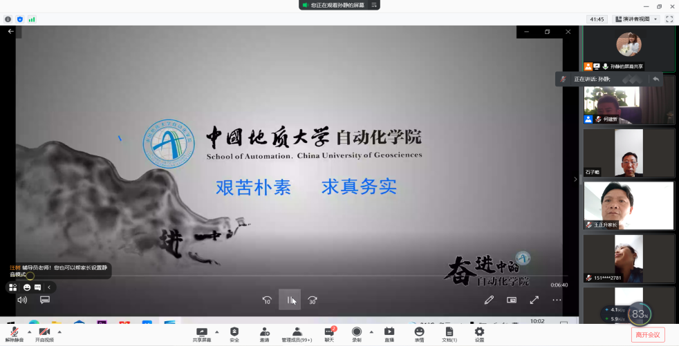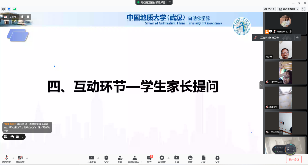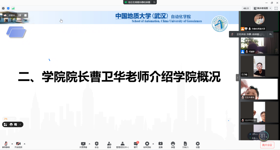 2021年9月4日上午10点,公司召开2021级新生家长线上座谈会。公司党委书记董浩斌老师、经理曹卫华老师、公司党委副书记何建新老师、副经理陈鑫老师、副经理宗小峰老师、副经理熊永华老师、副经理陈略峰老师、自动控制系系主任安剑奇老师、测控技术与仪器系系主任董凯锋老师、智能系统研究所所长刘振焘老师以及其他老师参加本次座谈会。公司召开此次新生家长座谈会旨在更好促进家校联合,让家长们对公司和公司有更加深入地了解。