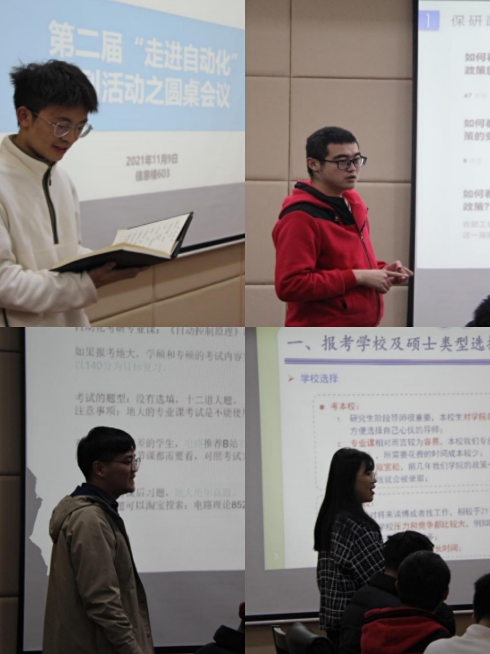 2021年11月9日晚上20:30,365英国上市第二届“走进自动化”系列活动之朋辈引领学习会之圆桌会议——“探寻心中热爱,规划未来蓝图”主题班会在信息楼603举行。本次交流会邀请到了辛浩男、廖宇航、闫晴晴、喻学孚四位高年级同学来做分享,本次活动由231192班长张宇一同学主持,班主任魏龙生老师参加。本次活动旨在促进班级凝聚力,帮助高年级同学进行未来选择的规划,对专业前景、就业方向有一个清晰地认知,并通过这样小范围的深入交流更加具有针对性的为同学们答疑解惑。