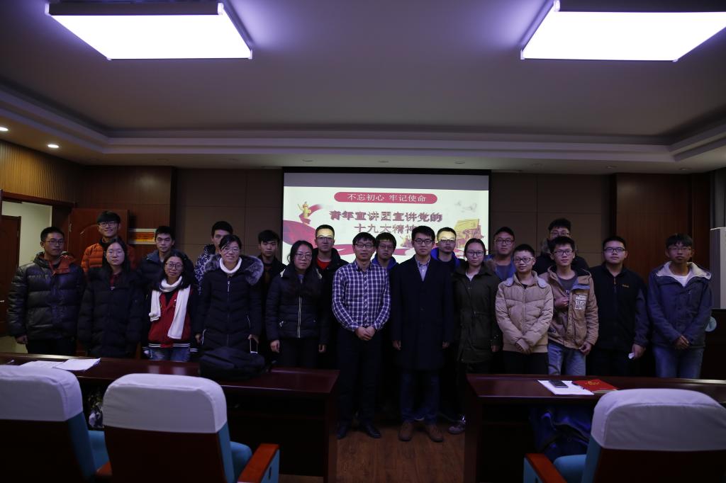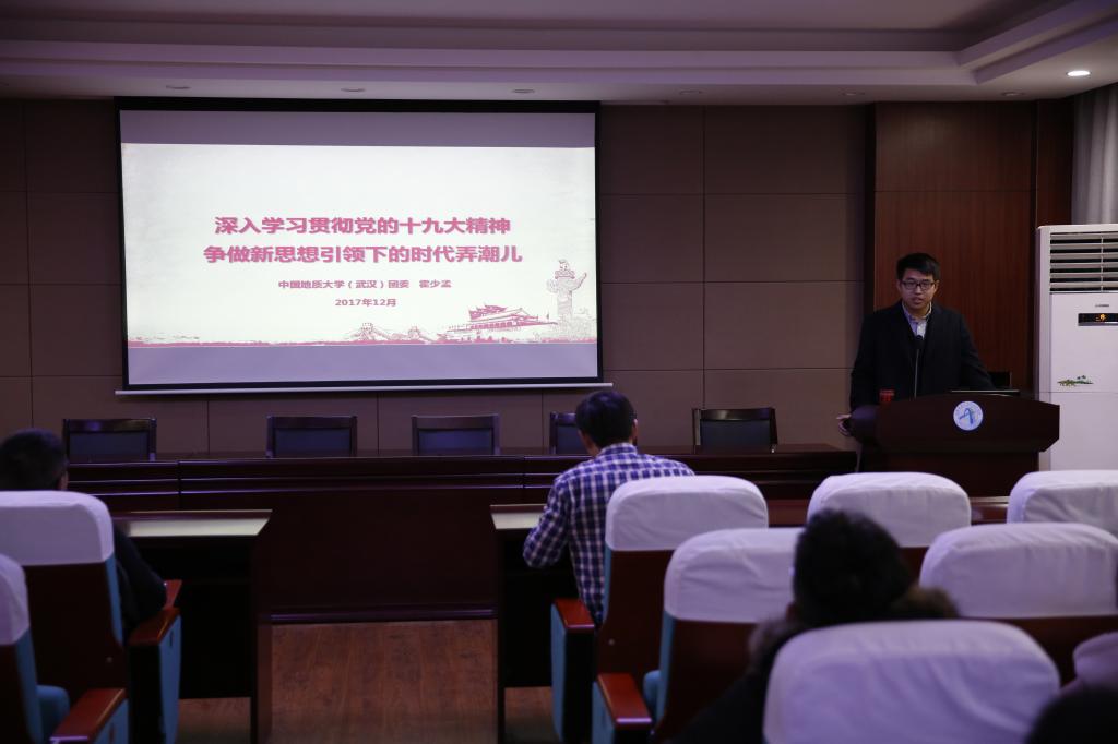 霍少孟老师发表了生动的演讲。霍老师在宣讲前向团员们提出“前瞻性”一词,解释说明了学习党的十九大精神的重要性。随后霍老师谈到团员的自我发展,并围绕党的十九大精神的总体把握、学习贯彻党的十九精神系列部署、党的十九大的所取得的成果以及对党的十九大精神的四个深刻学习领会等四个方面来进行宣讲。霍老师向团员们介绍了党的十九大的召开情况以及所取得的理论和实践等成果,讲述了习近平总书记的知青岁月故事,讲解了十九大的主要议程并分享了自己支教一年的经历与感受。最后,霍老师给青年团员们提出了几点建议:在“理想信念,价值养成”的追寻中培育家国情怀;在“艰苦朴素,求真务实”的校训中学思地大精神;在“奉献担当,勇攀高峰”的宣言中践行青春价值;在“心存大道 行向远方”的修行中体悟人生真谛。