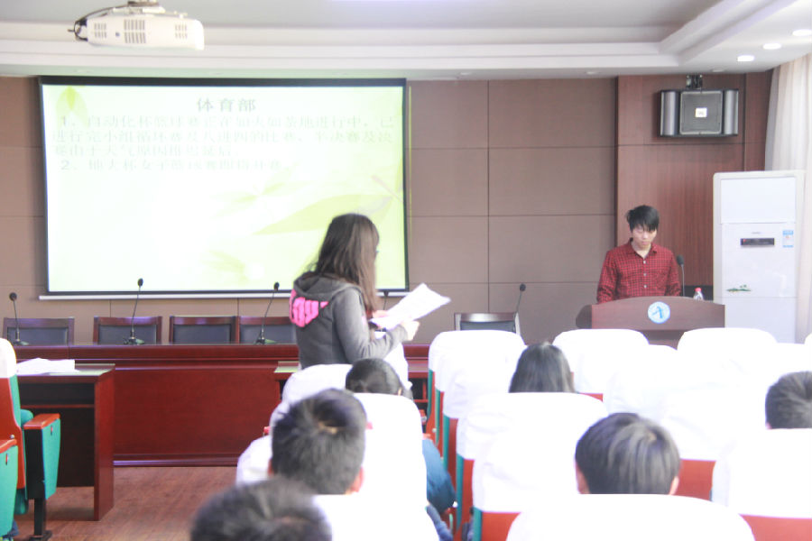 会议第一项内容,由团学联各部门代表人发言。各部门针对近期活动的工作进行了总结,并对下周团学联的工作作出安排。办公室提醒各班需要在4月4日之前上交本班的月评材料;组织部汇报团支书手册的评比结果,告知大家精品团会设计大赛、第三只眼社会观察活动以及五四评优的工作安排;志愿者协会将组织清明节扫墓活动和四月份的“最美花卉评选大赛”;学风部要求各班及时反馈自查情况并于今天下午进行寝室大检查;科创部提醒“风磁电车大赛”报名结束的时间;信息部鼓励大家积极参加校领导接待日的活动并踊跃向院刊投稿;文艺部“寝室文化节之交换空间”的报名筹备活动已开始;体育部“自动化杯篮球赛”正在火热进行中,女子篮球比赛即将开幕;其余部门的活动工作也都在合理的安排下有序进行。