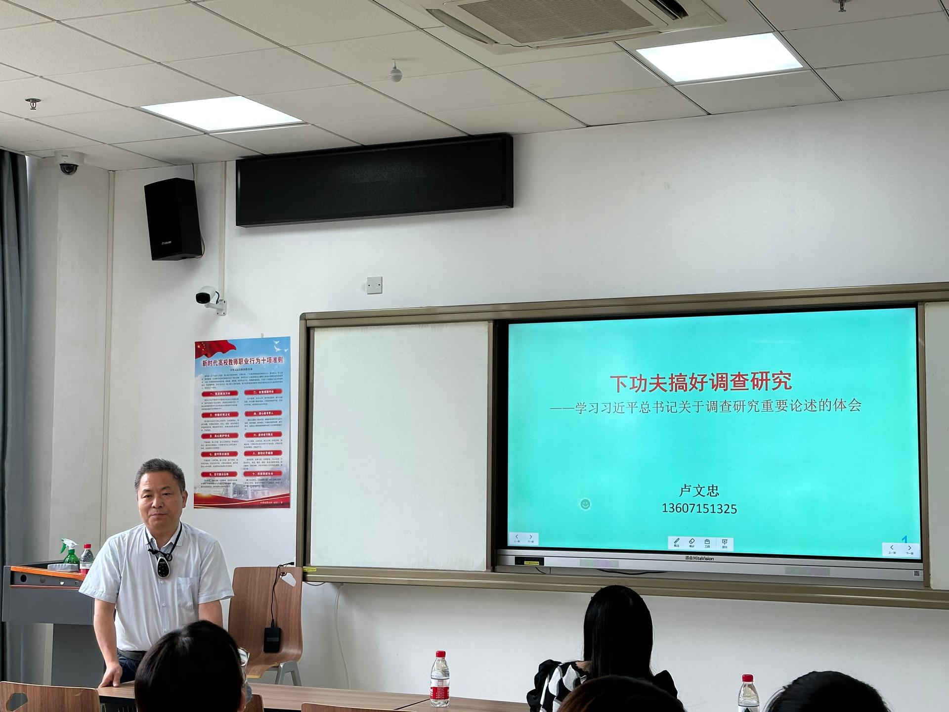 紧接着,辅导员孙静老师针对社会调查的工作安排和工作要求做了进一步说明和讲解。随后,卢文忠教授以《下功夫搞好调查研究——学习习近平总书记关于调查研究重要论述的体会》为题,给同学们做了如何开展社会调查和撰写社会调查报告的具体指导,讲解了社会调查的目的、方法,针对调研报告中的调研目的、调查对象、调查内容、重点探讨问题、调查形式、问卷调查设计等多方面进行了讲解,引导同学们把调查研究走深、把报告写实,同学们收获颇丰。