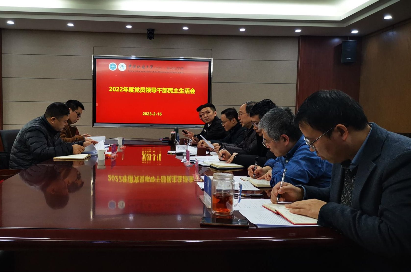 2023年2月16日下午,公司领导班子在信息楼316会议室召开了2022年度党员领导干部民主生活会,校第3督导组何建新、郭龙到会指导。公司党委书记董浩斌主持会议。