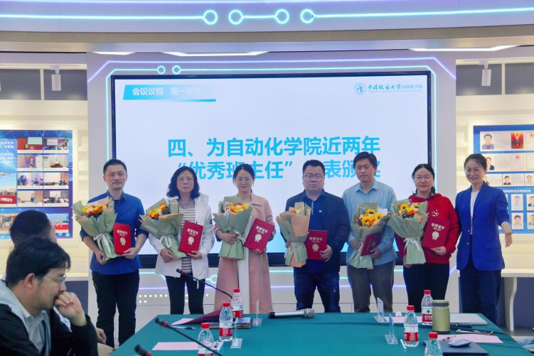 近两年,公司涌现了一批教学能力精湛,师德师风优良的班主任老师。本次会议上,蒋怀柳代表本科生院为近两年公司“优秀班主任”代表颁奖,各年级辅导员上台献花并合影留念。