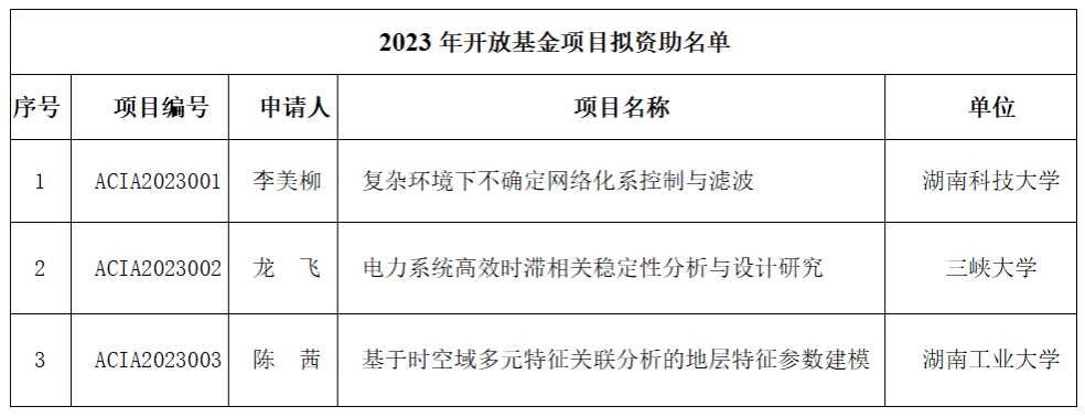 根据《复杂系统先进控制与智能自动化湖北省重点实验室、地球探测智能化技术教育部工程研究中心、教育部复杂系统先进控制与智能自动化学科创新引智基地2023开放基金项目申请指南》和开放基金项目申请通知,按照“公平竞争,交叉融合”的原则,对申报的3项开放基金项目申请书进行了专家审议,拟资助 “复杂环境下不确定网络化系控制与滤波”等3个项目为2023年开放基金项目,现予以公示。公示时间:2023年12月22日至2023年12月28日。公示期间,如对项目资助有异议,请以书面形式反馈公司办公室。